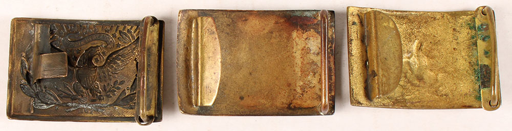 RARE!! US, all three patterns of 1874 Army officers brass belt buckles eagles from 1874-1900's. two solid & one stamped back. One is partially tarnished brown on the front & back, one has some black tarnishing in protected spots on the front & back (stamped back buckle), & the other is mostly clean with one spot of brown tarnish. All buckles varying amounts of green corrosion. Grade: Very Good ++ - Value: 500 to 750