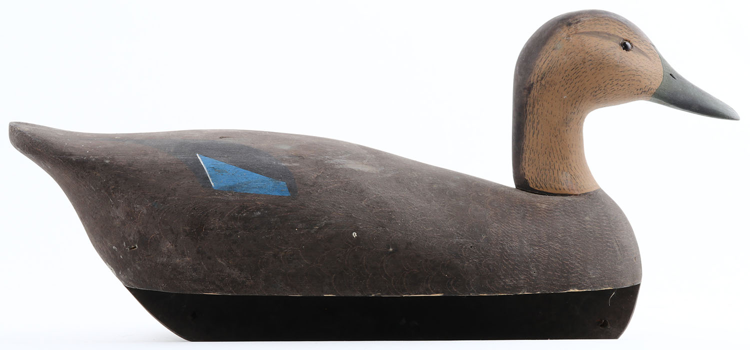 Black Duck by Ken Harris, Woodville, NY, glass eyes, structurally excellent, hollow wood, well marked on bottom, original paint is very nice, 18 1/4'' OAL. Grade: Excellent + - Value: 100 to 250