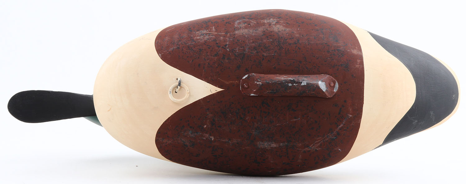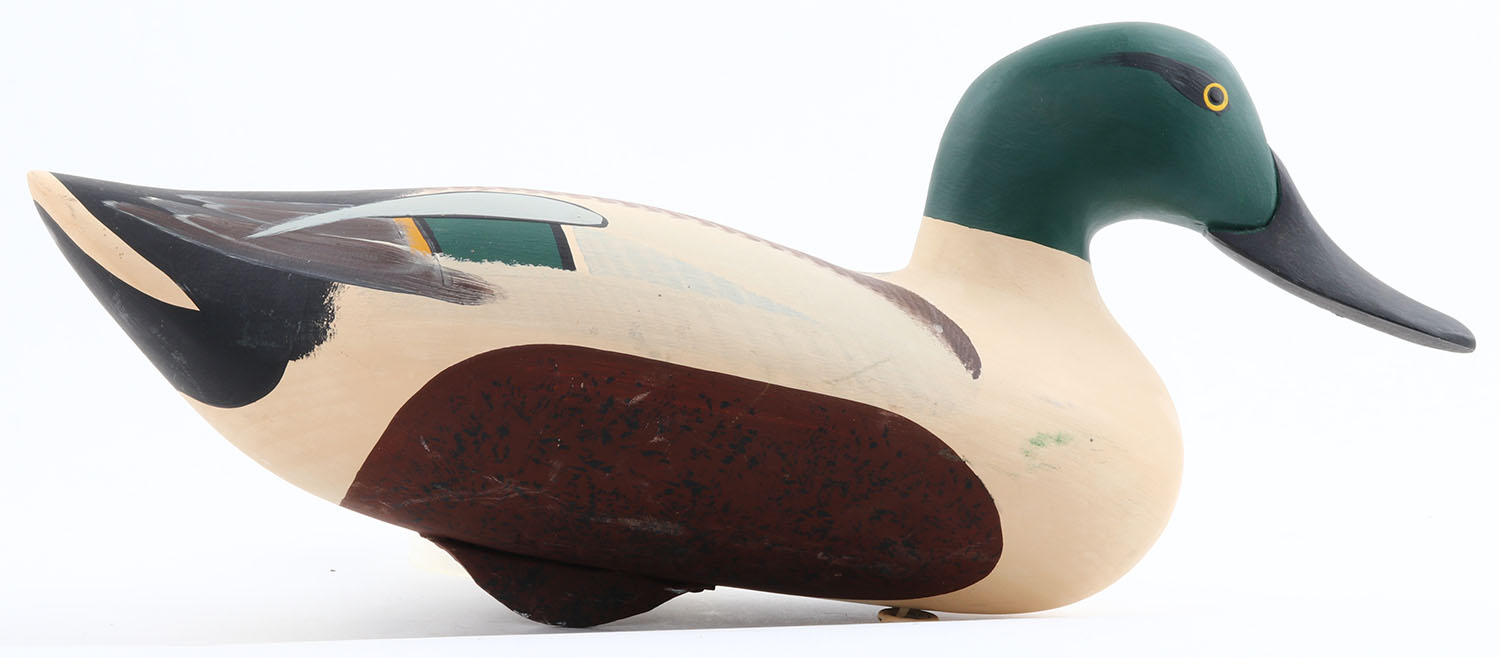 Shoveler Drake by David Walker, MD, painted eyes, solid wood, original paint, structurally excellent, branded on bottom ''WALKER'', 17''. Grade: Excellent ++ - Value: 40 to 80