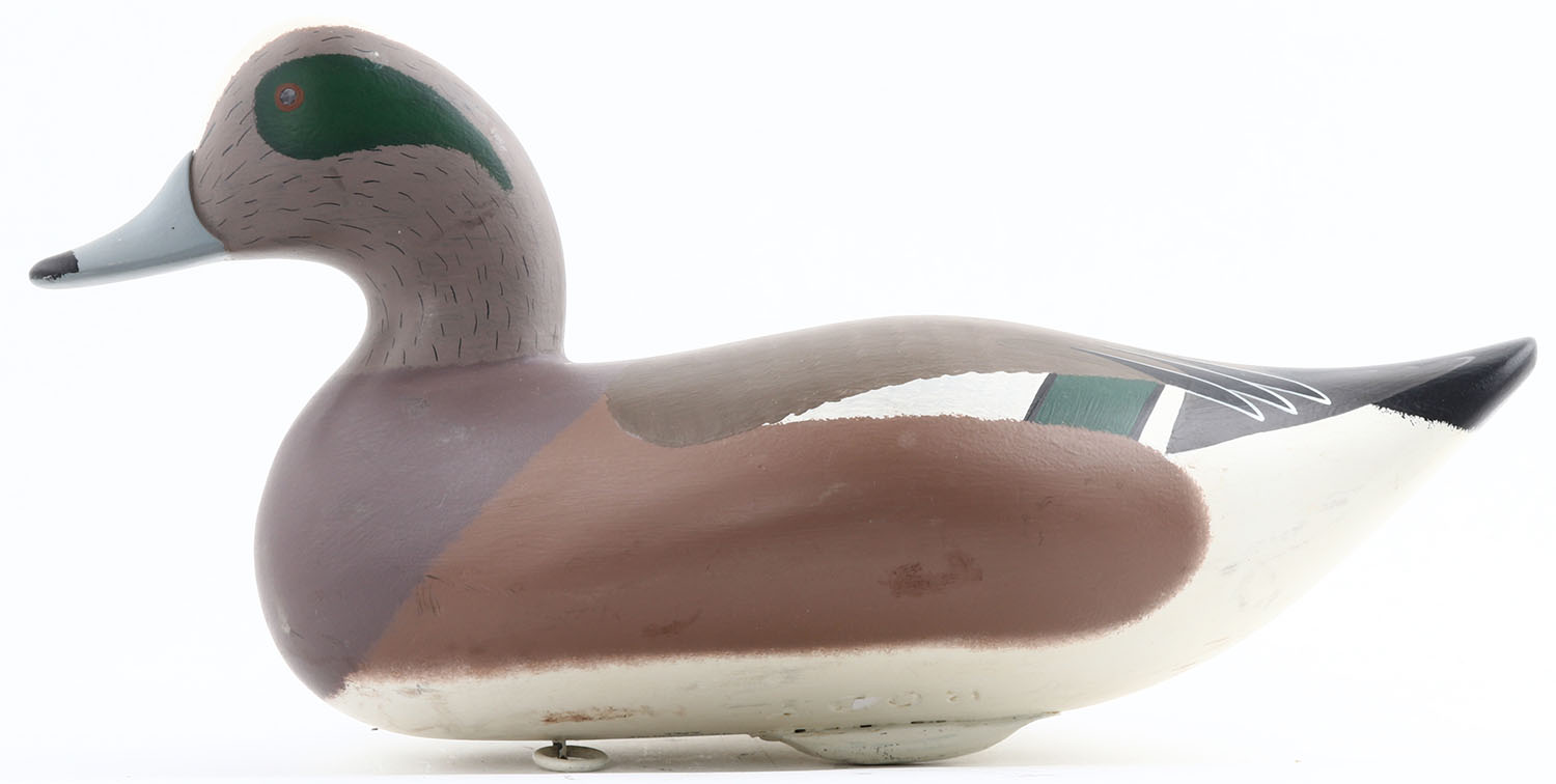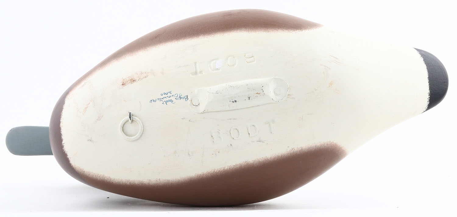Widgeon Drake by Bryan Bodt, Churchville, MD, painted eyes, hollow wood, original paint, structurally excellent, branded BODT on bottom & signed, 14 1/2'' OAL. Grade: Excellent ++ - Value: 30 to 60