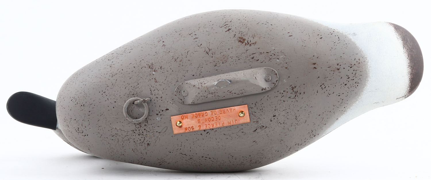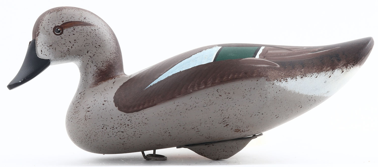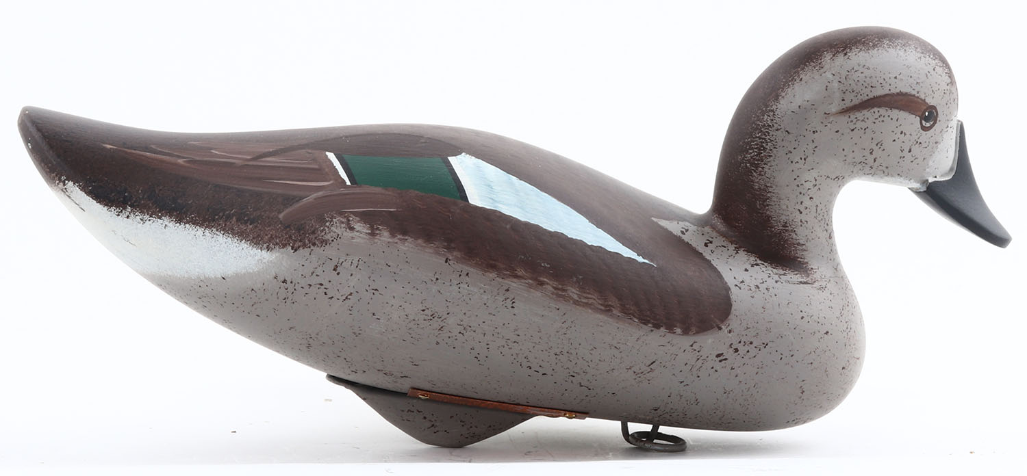 Greenwing Teal Hen by Jim Pierce, Havre De Grace MD, painted eyes, solid wood, structurally excellent, has copper metal tag with name on bottom, 12'' OAL. Grade: Excellent ++ - Value: 40 to 100