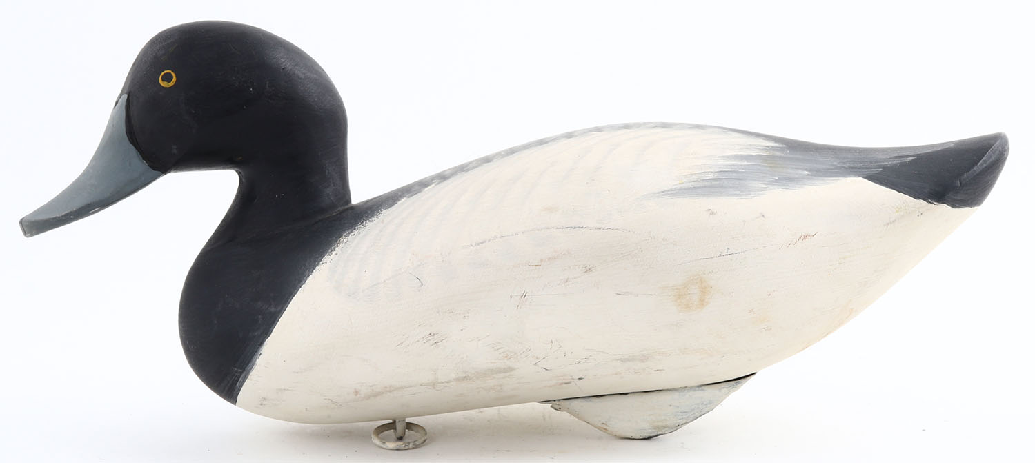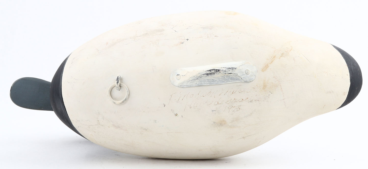 Bluebill Drake by R. Madison Mitchell, Havre de Grace, MD, PE, solid wood, original paint, signed on bottom, 15'' OAL. Grade: Excellent + - Value: 100 to 200