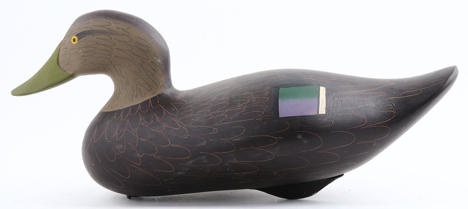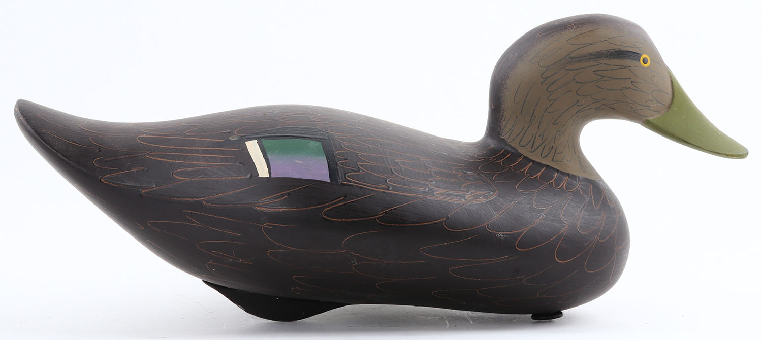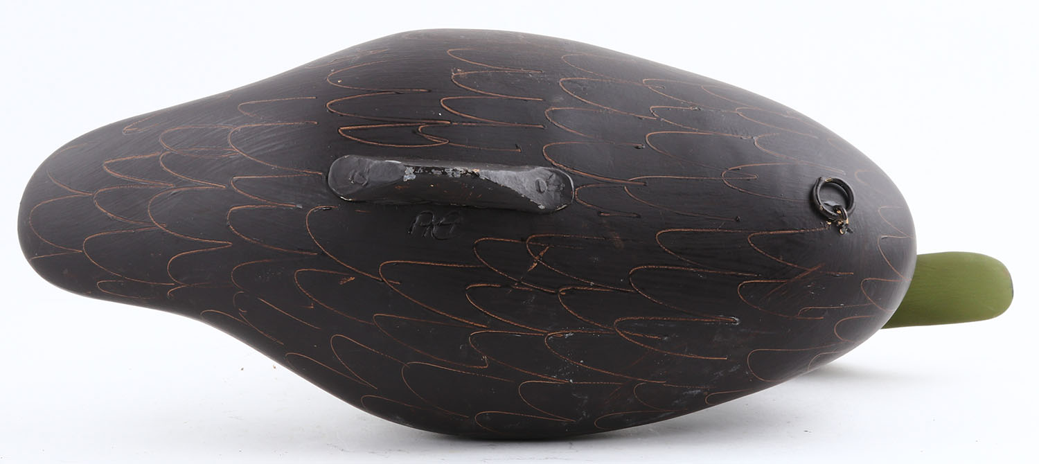 Black Duck by unknown MD maker, branded ''BU'', painted eyes, hollow wood, original paint, structurally excellent, 16''. Grade: Excellent - Value: 40 to 80