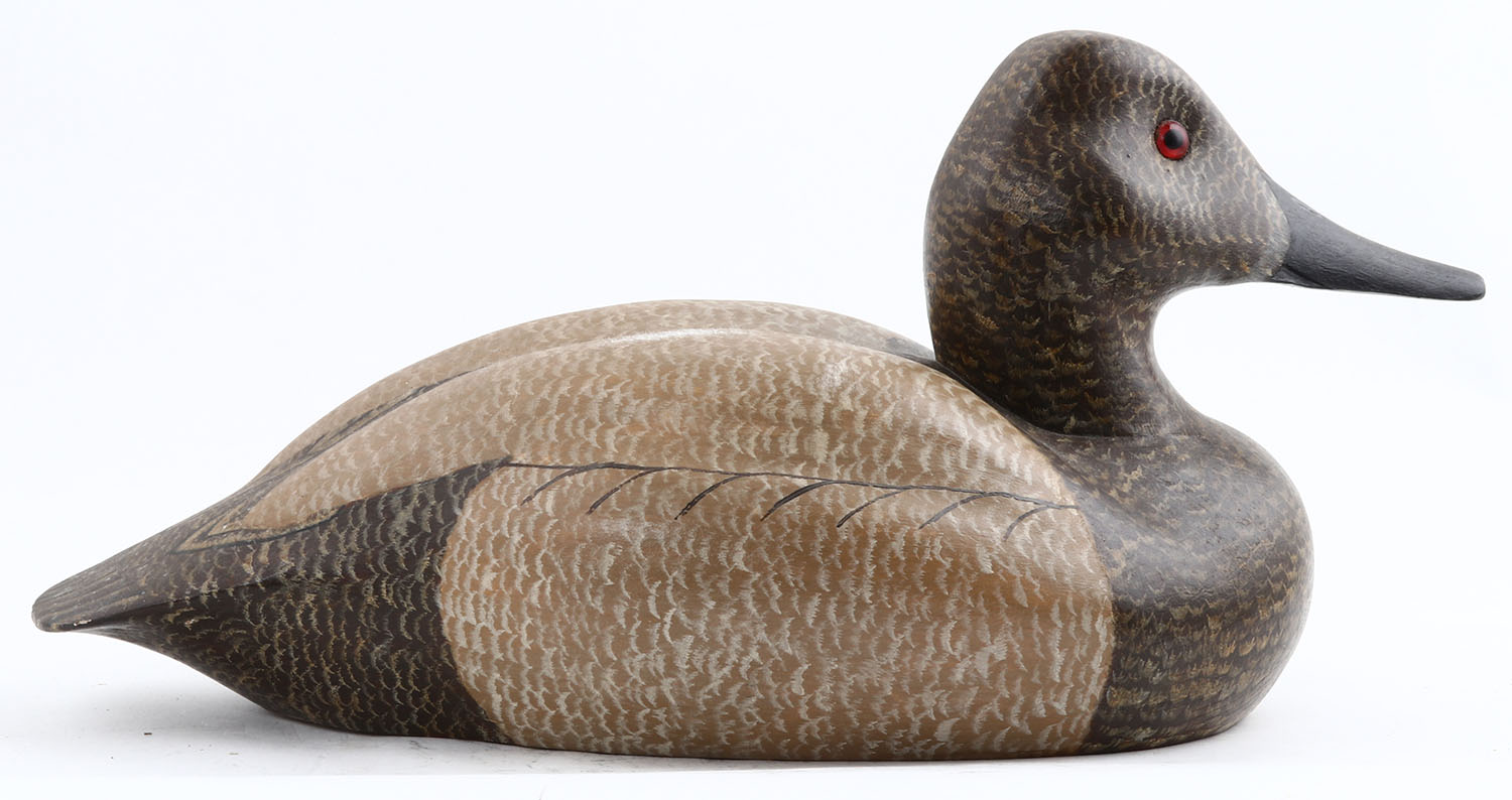 Canvasback Hen by WJ, GE, hollow wood, original paint, structurally excellent, signed on bottom, 14'' OAL. Grade: Excellent - Value: 20 to 80