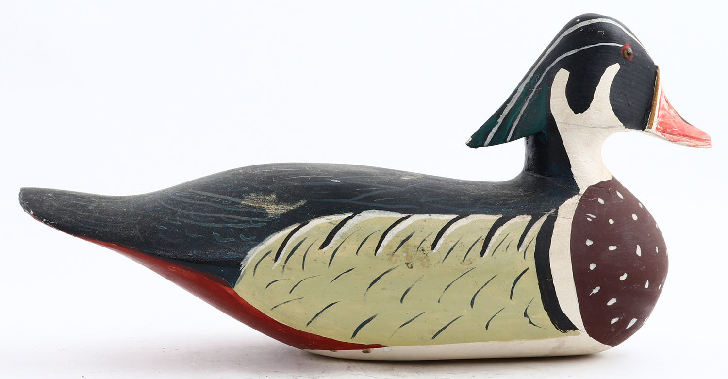 Woodduck Drake by JEH and so branded on bottom, TE, hollow wood, original paint, bill has been broken & shows only a hair line crack, 13'' OAL. Grade: Very Good + - Value: 20 to 60