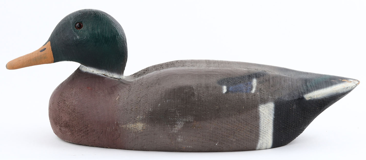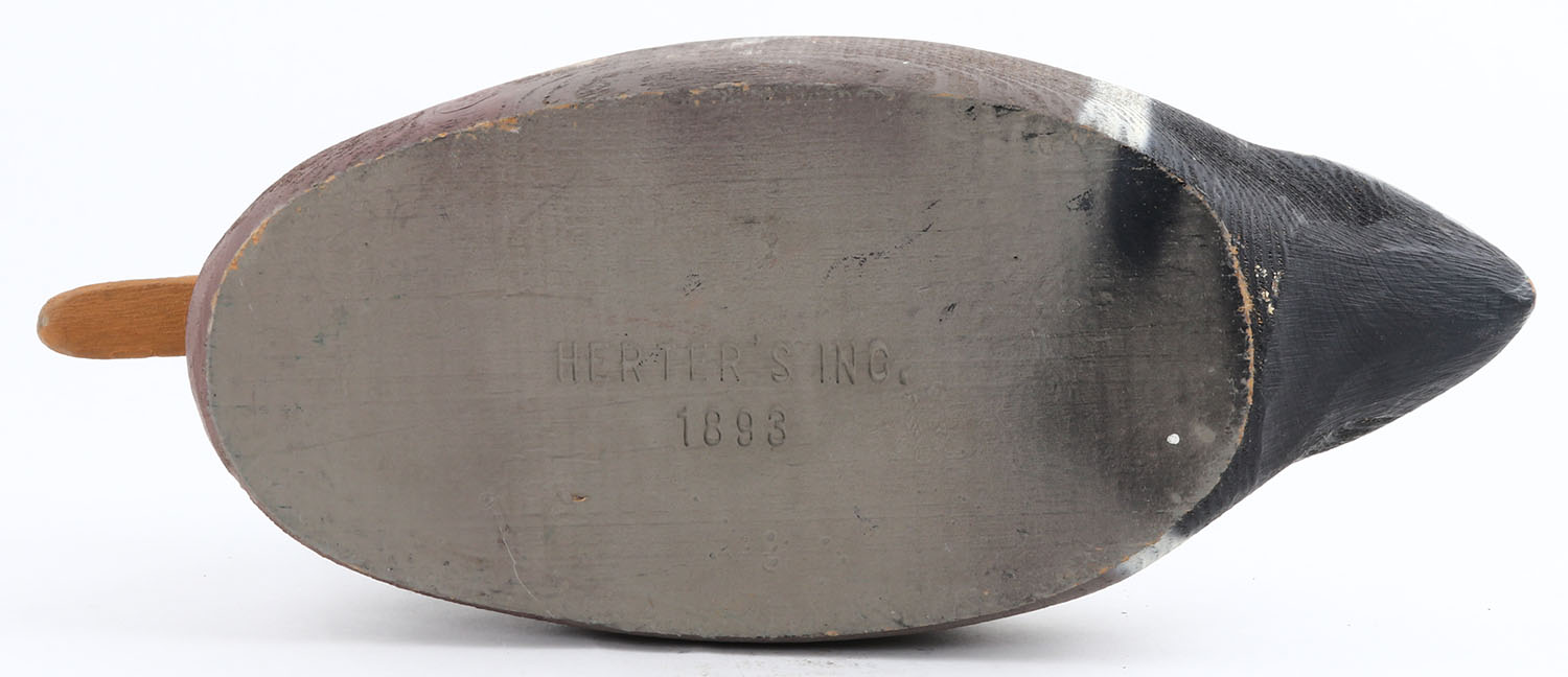 Mallard Drake by Herters Decoy Co., Waseca, MN, 1893 series, glass eyes, solid wood, original paint, structurally excellent, marked on bottom. Grade: Excellent ++ - Value: 50 to 300
