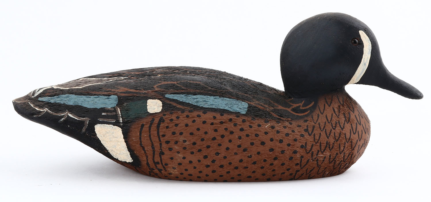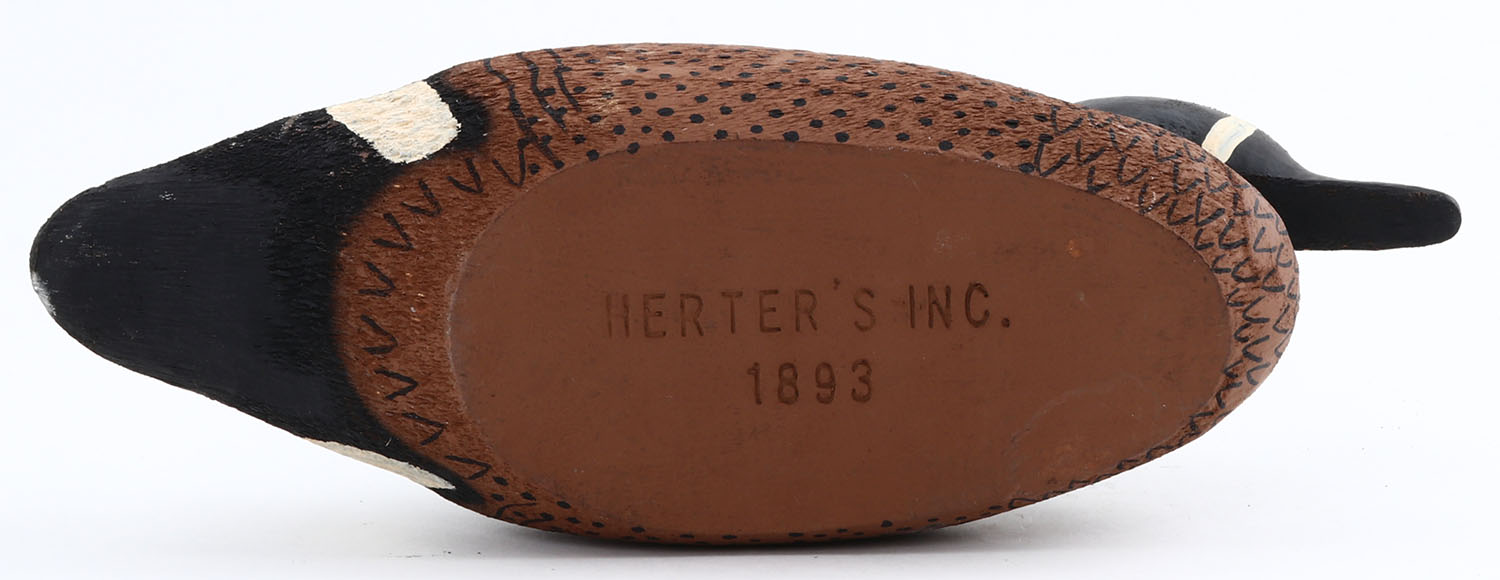 Bluewing Teal Drake by Herters Decoy Co., Waseca, MN, 1893 series, glass eyes, solid wood, original paint, structurally excellent, marked on bottom. Grade: Excellent ++ - Value: 50 to 300