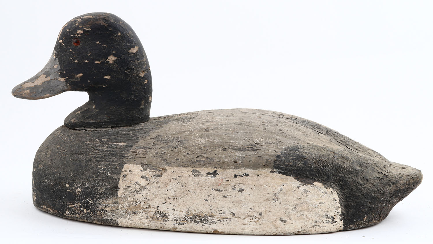 Bluebill Drake by unknown maker, GE, solid balsa wood, worn old repaint, structurally excellent. Grade: Very Good + - Value: 20 to 60