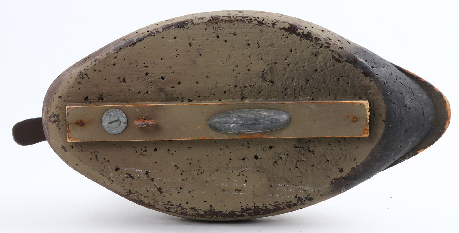 Bluebill Hen by LL Bean, unmarked on keel, glass eyes, solid cork body, wood head, original paint, structurally excellent, 17'' OAL. Grade: Excellent + - Value: 20 to 60