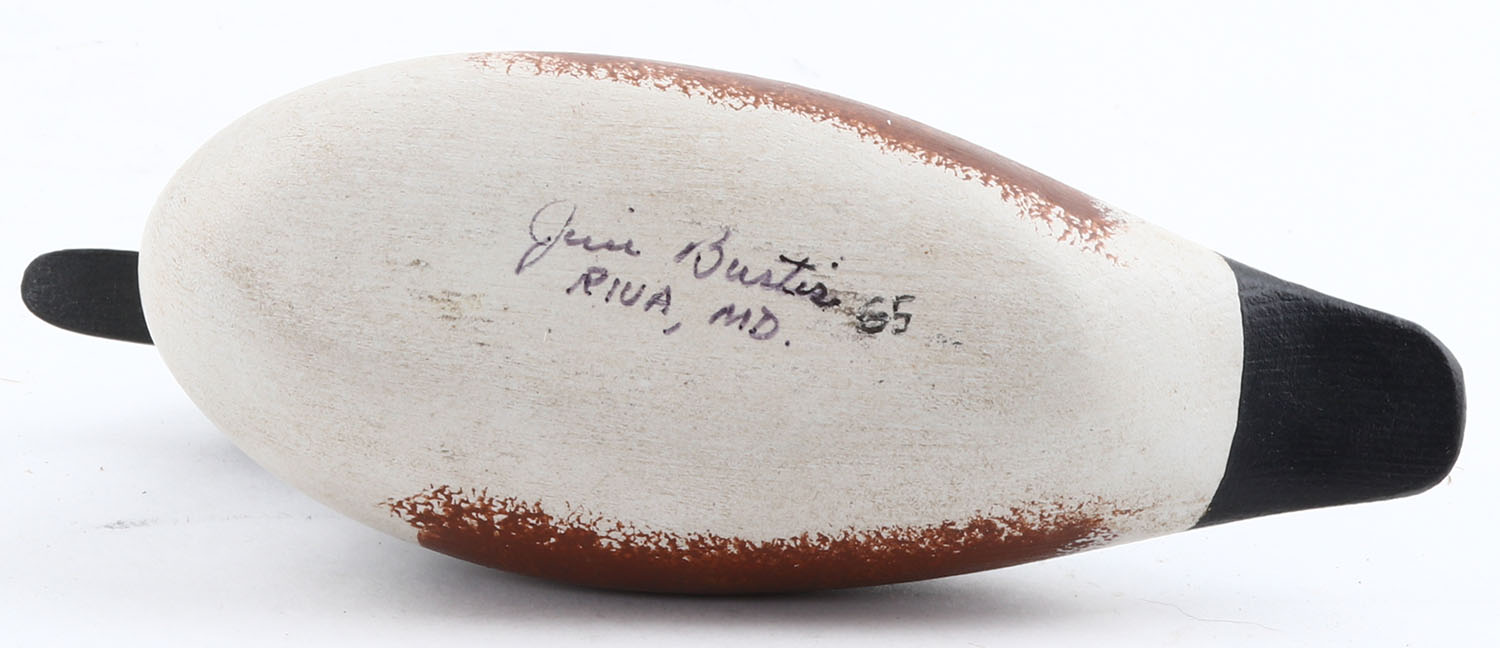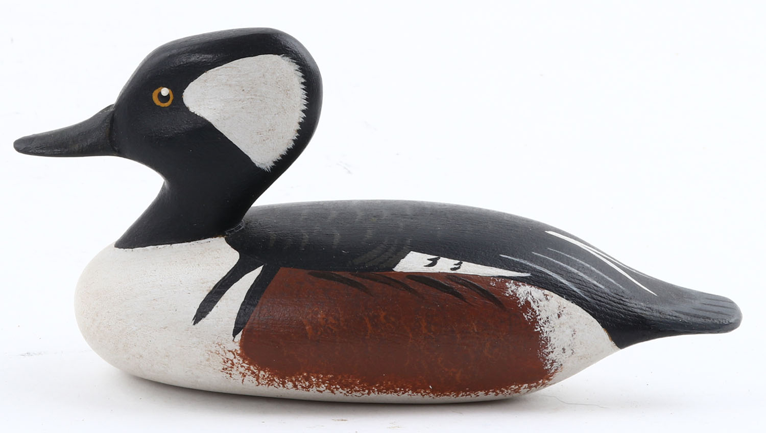 Miniature Hooded Merganser Drake by Juile Bustir and so marked on bottom, PE, solid wood, mint paint, circa 1965, 6'' OAL. Grade: MINT - Value: 30 to 60