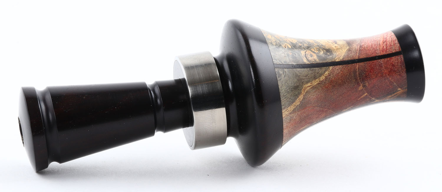 Brian Meyer Duck Call (Turkey River Calls), Guttenburg, IA, circa 1969-?, signed & dated on inside, plastic reed, 5'' OAL, nice finish, interesting inlaid pattern on barrel, comes with microfiber pouch. Grade: Excellent - Value: 120 to 250