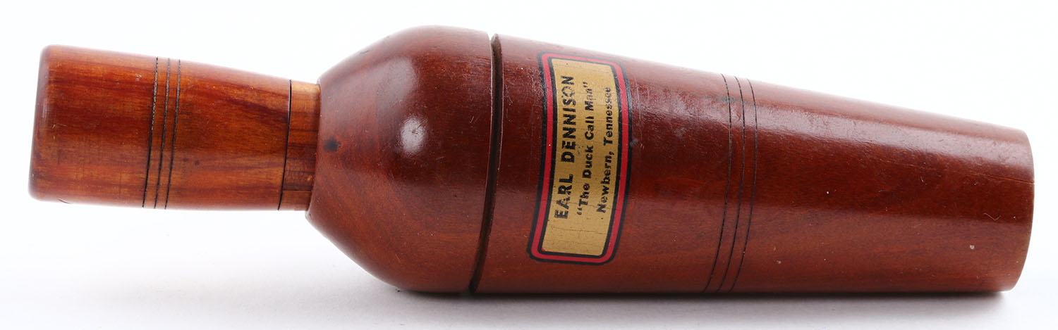 Earl Dennison Duck Call, Newbern, TN, marked on outside of barrel with sticker, metal reed, 6'' OAL, nice finish, some light handling marks. Grade: Excellent - Value: 100 to 200