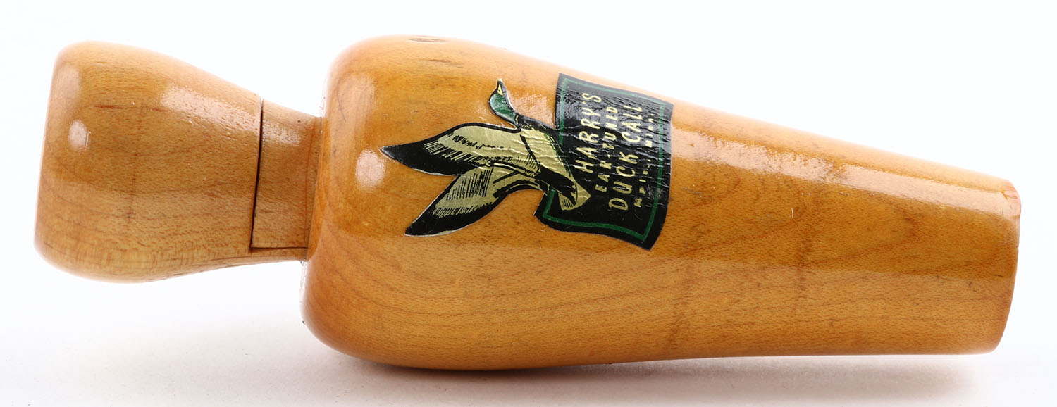 Harry's Ear-Tuned Duck Call, Mpls, Minn, marked on outside of barrel with sticker, copper reed, 5'' OAL, nice finish, eyelet loop, one small grain crack coming from the bottom of the barrel. Grade: Very Good - Value: 40 to 100