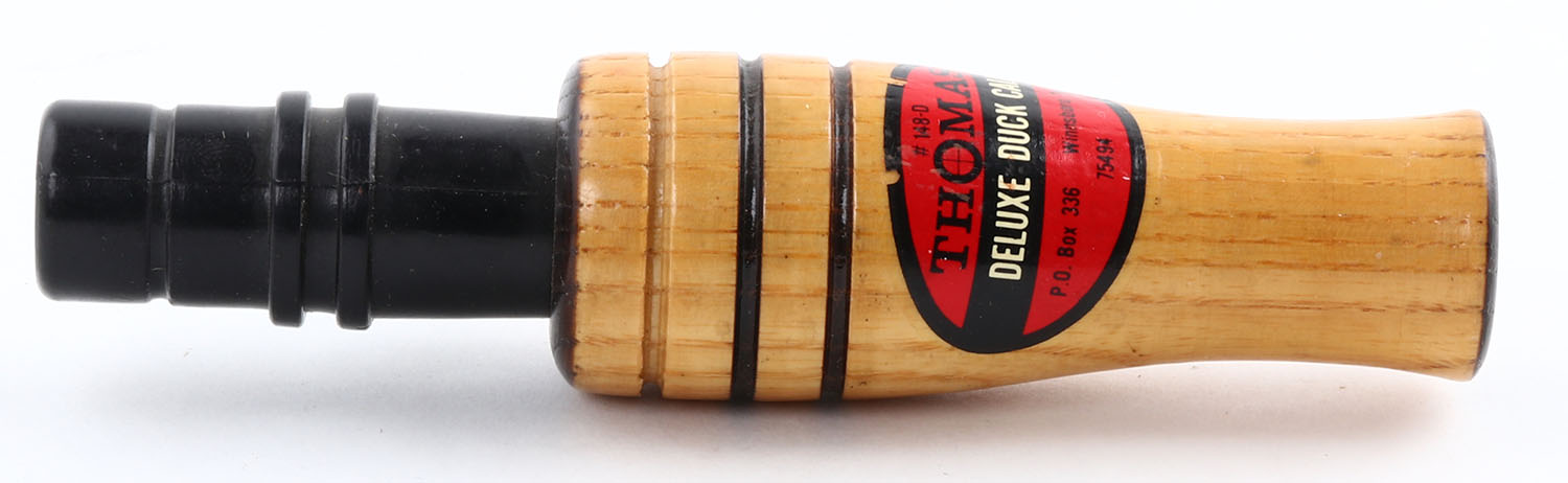Thomas Deluxe Duck Call, Winnsboro, TX, #148-D, marked with sticker on barrel, 5'' OAL, wood body & plastic mouth piece, nice finish on barrel. Grade: Excellent - Value: 20 to 60