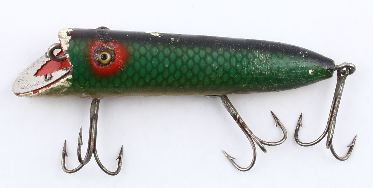 Heddon Basser, wood lure, GE, green scale, 3 hooks, metal lip, marked, 4'' OAL. Grade: Very Good - Value: 10 to 50
