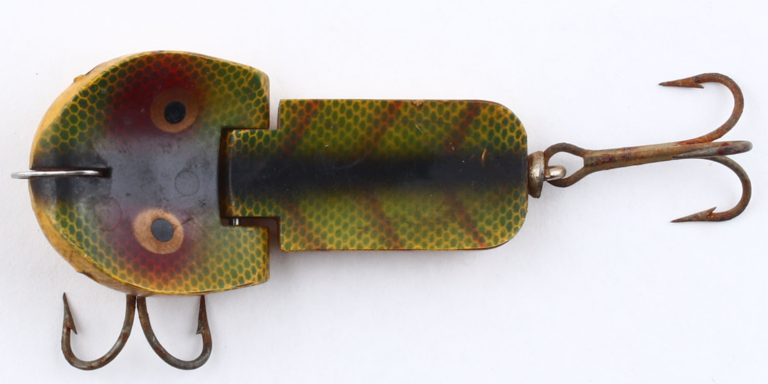 Heddon Stingaree, plastic lure, PE, 2 hooks, green & yellow scales with black & red stripes, marked on belly. Grade: Very Good - Value: 10 to 50