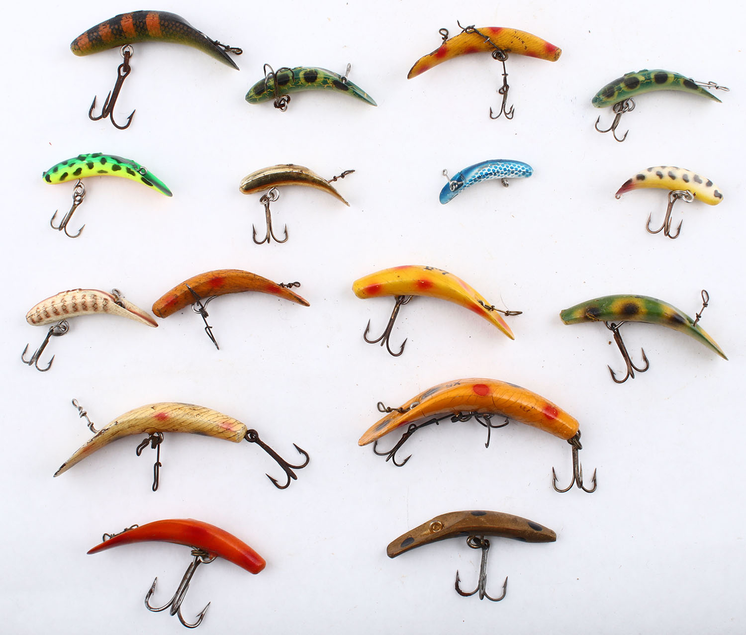 Lot of 15- fishing lures, all different colors/patterns/sizes. Grade: Very Good - Value: 10 to 50