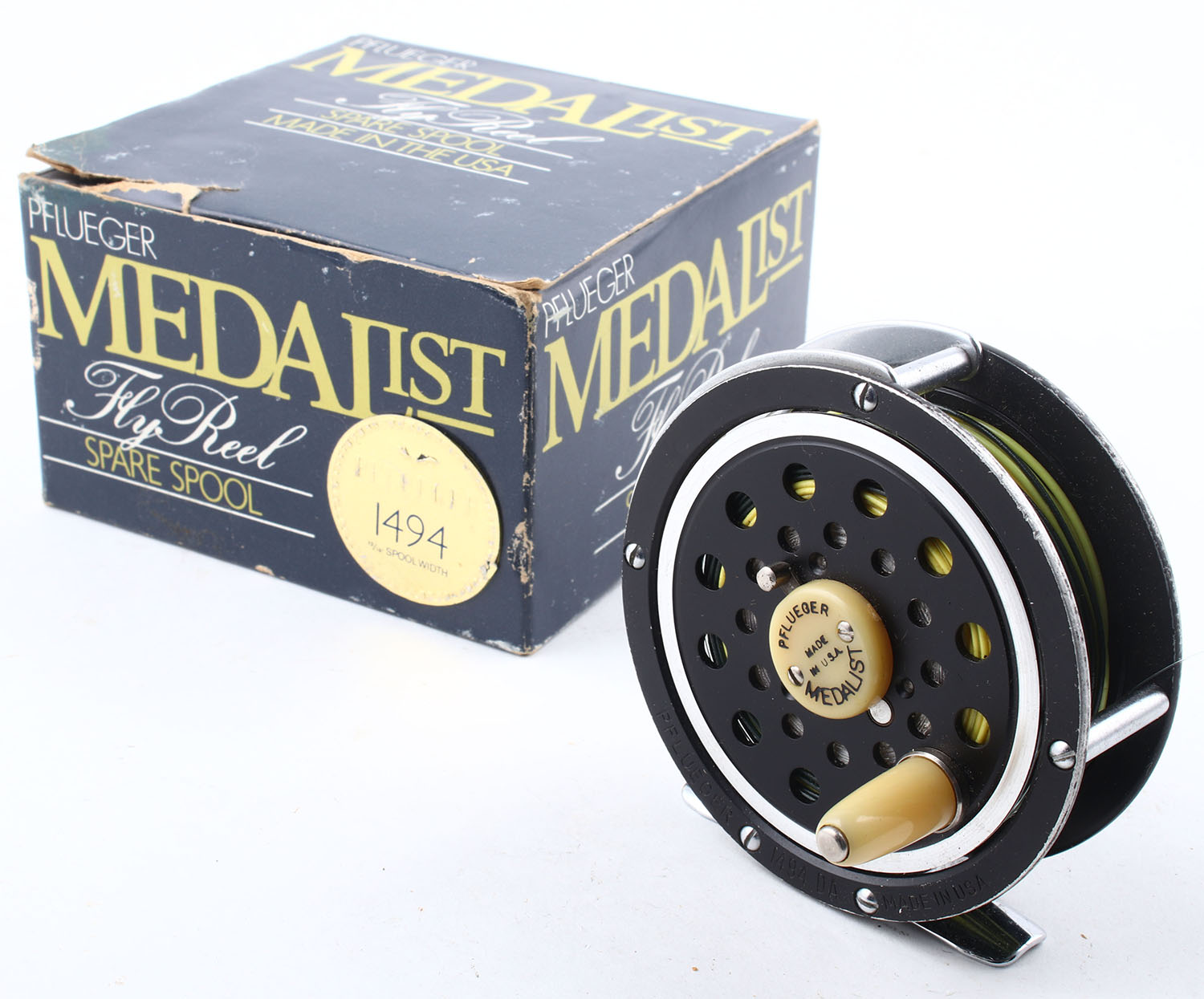 BOXED, Pflueger Medalist No. 1494 DA, single handle, marked on right side & outer ring, clear clicks, smooth reel turn, comes in original box. Grade: Excellent - Value: 10 to 50