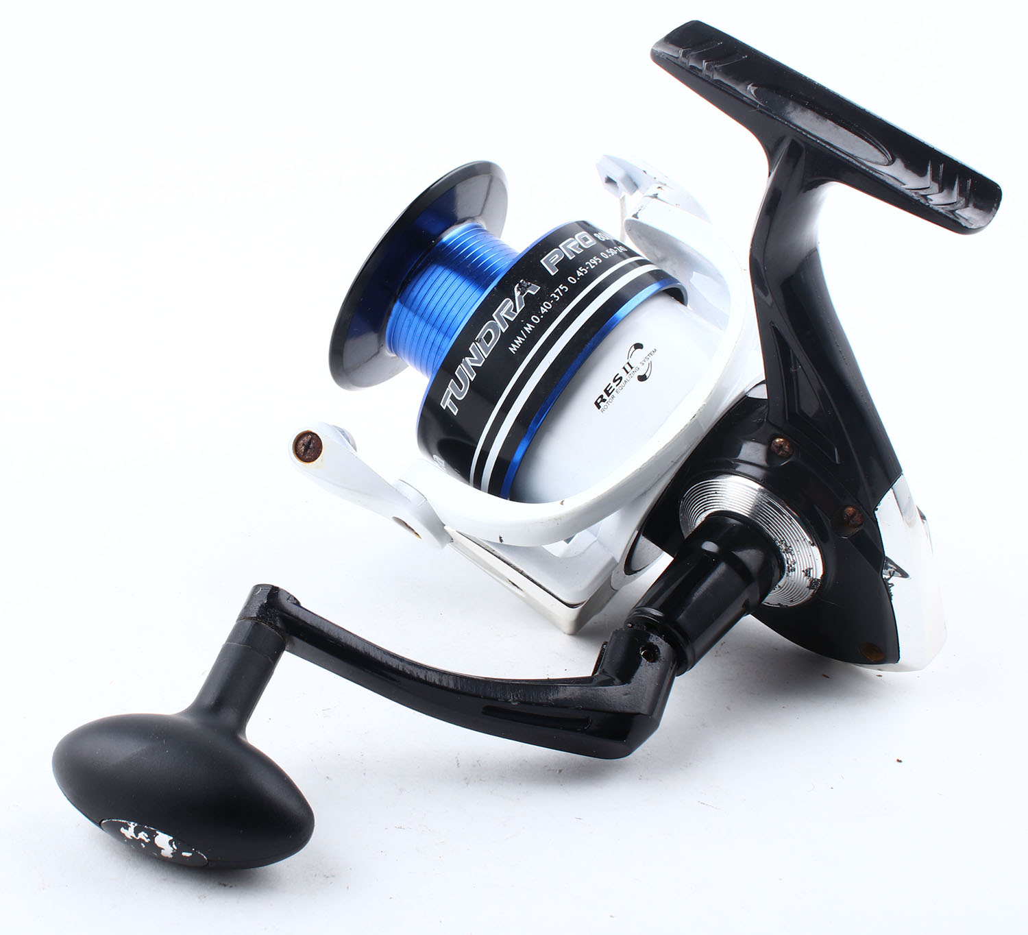 Okuma Tundra Pro, spinning reel, single handle, quite a bit of tension when turning handle, bearings might need to be replaced. Grade: Good++ - Value: 10 to 50