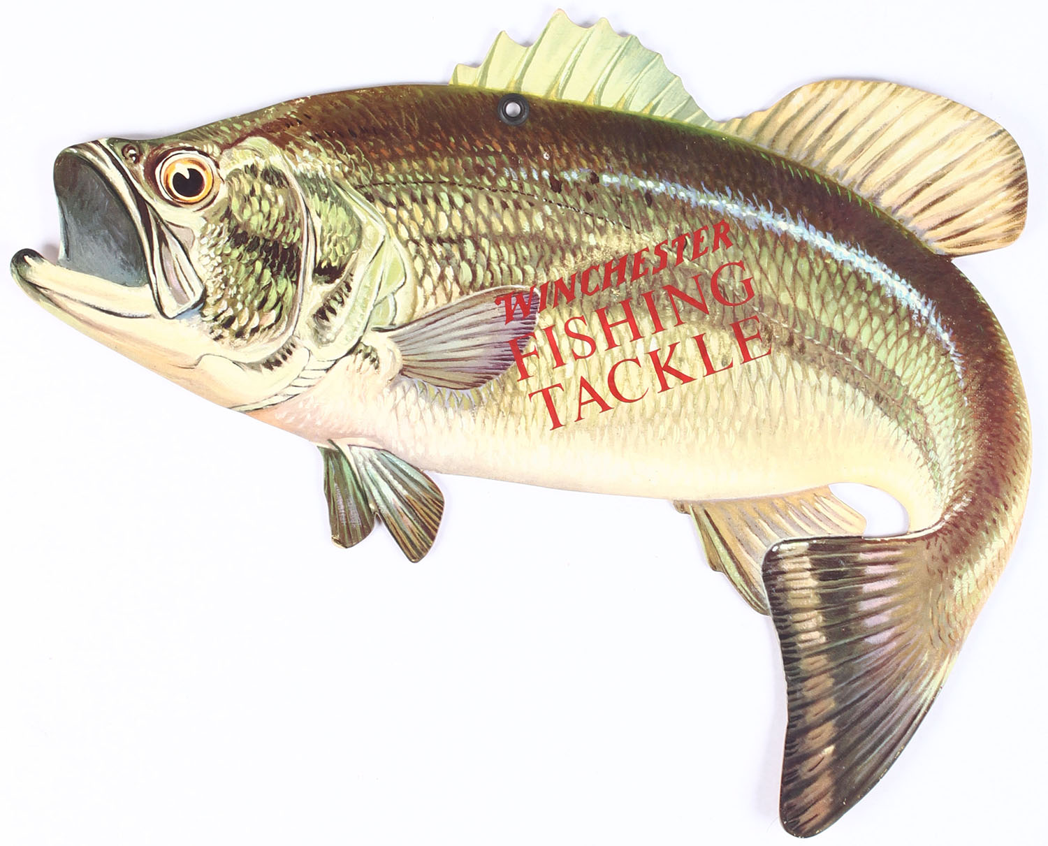 Winchester Fishing Tackle Diecut, full color bass, metal eyelet hanger, excellent colors, not actually produced by Winchester, 18 1/4'' x 13''. Grade: Excellent ++ - Value: 40 to 250