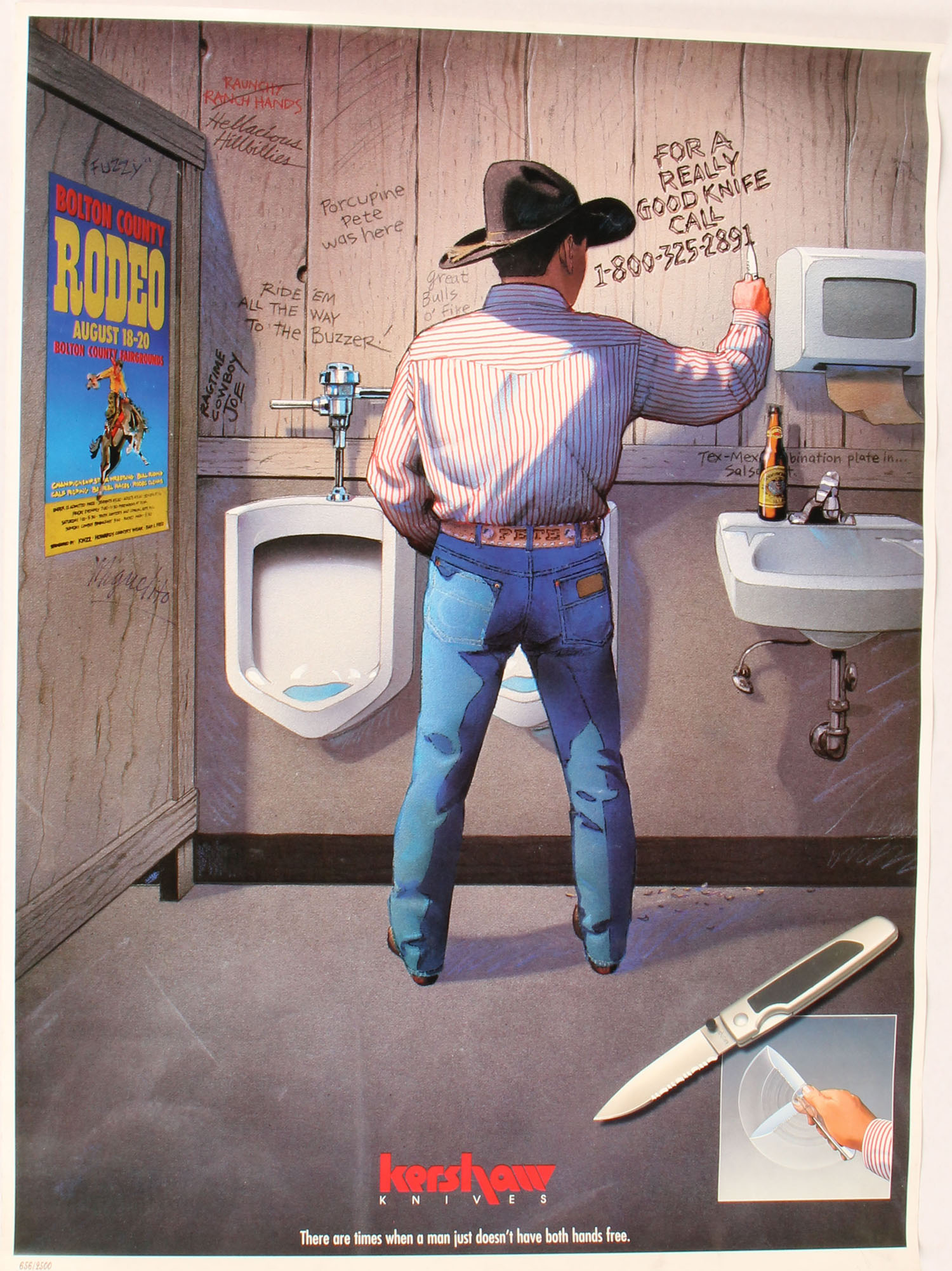 Kershaw Knives Poster, shows a cowboy carving into the bathroom wall. Grade: Excellent++ - Value: 10 to 50