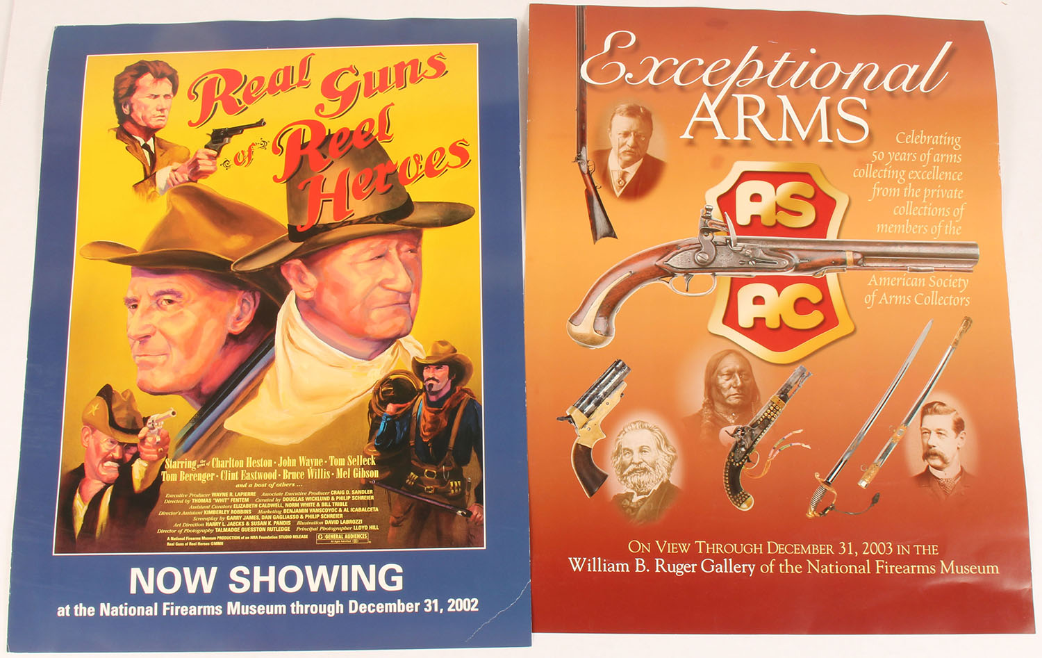 Lot of 2 gun related NRA Museum promotional posters, (1) ''Real Guns of Reel Heroes'', featuring Charlton Heston, John Wayne, Tom Selleck, Tom Berenger & Clint Eastwood in their movie roles. (1) Exceptional Arms, featuring firearms & edge weapons of famous individuals of American History. Both posters have full color images, with excellent colors, minor crease & edge wear. Grade: Excellent + - Value: 10 to 40