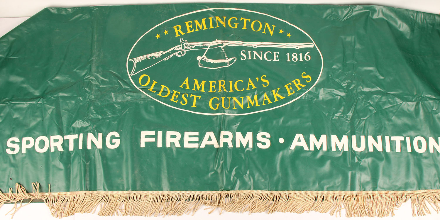 Remington Plastic tablecloth, marked ''REMINGTON AMERICA'S OLDEST GUNMAKER'', ''SPORTING FIREARMS AND AMNMUNITION'', possibly 1960's, has one small tear above the gun & white tassels have faded to tan, some light chipping to the wording. Grade: Very Good - Value: 40 to 100