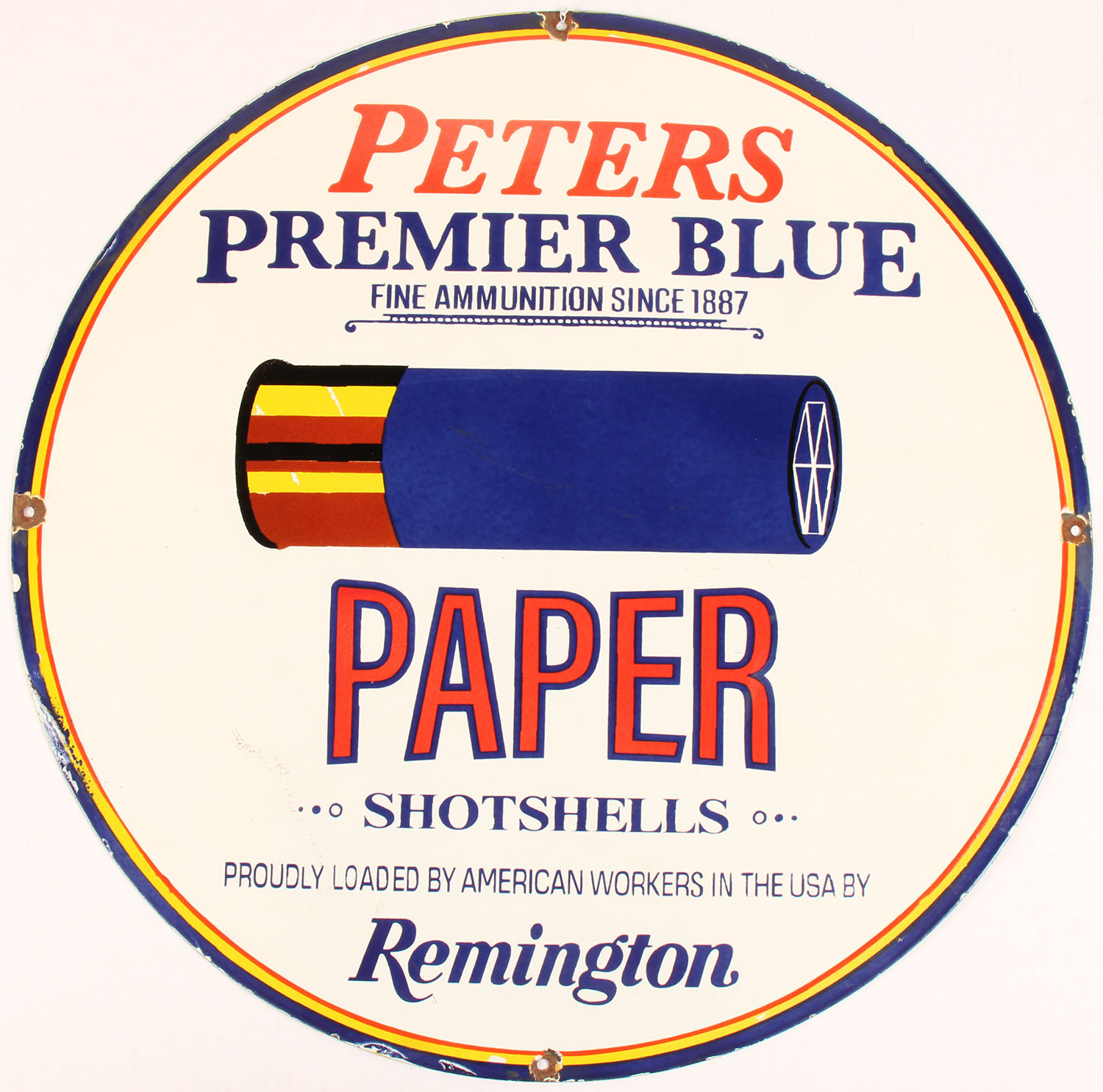 LARGE Peter's Premier Blue Porcelain Metal Sign, ''Fine Ammunition Since 1887'', ''Paper Shotshells Prould Loaded by American Workers In The USA by Remington'', white/blue/red/yellow sign, one sided, black back, Has image of shotshell in the middle, fantastic colors, minor chipping around the edge & around the hanger holes, otherwise excellent. 30'' diameter. Grade: Excellent - Value: 300 to 500