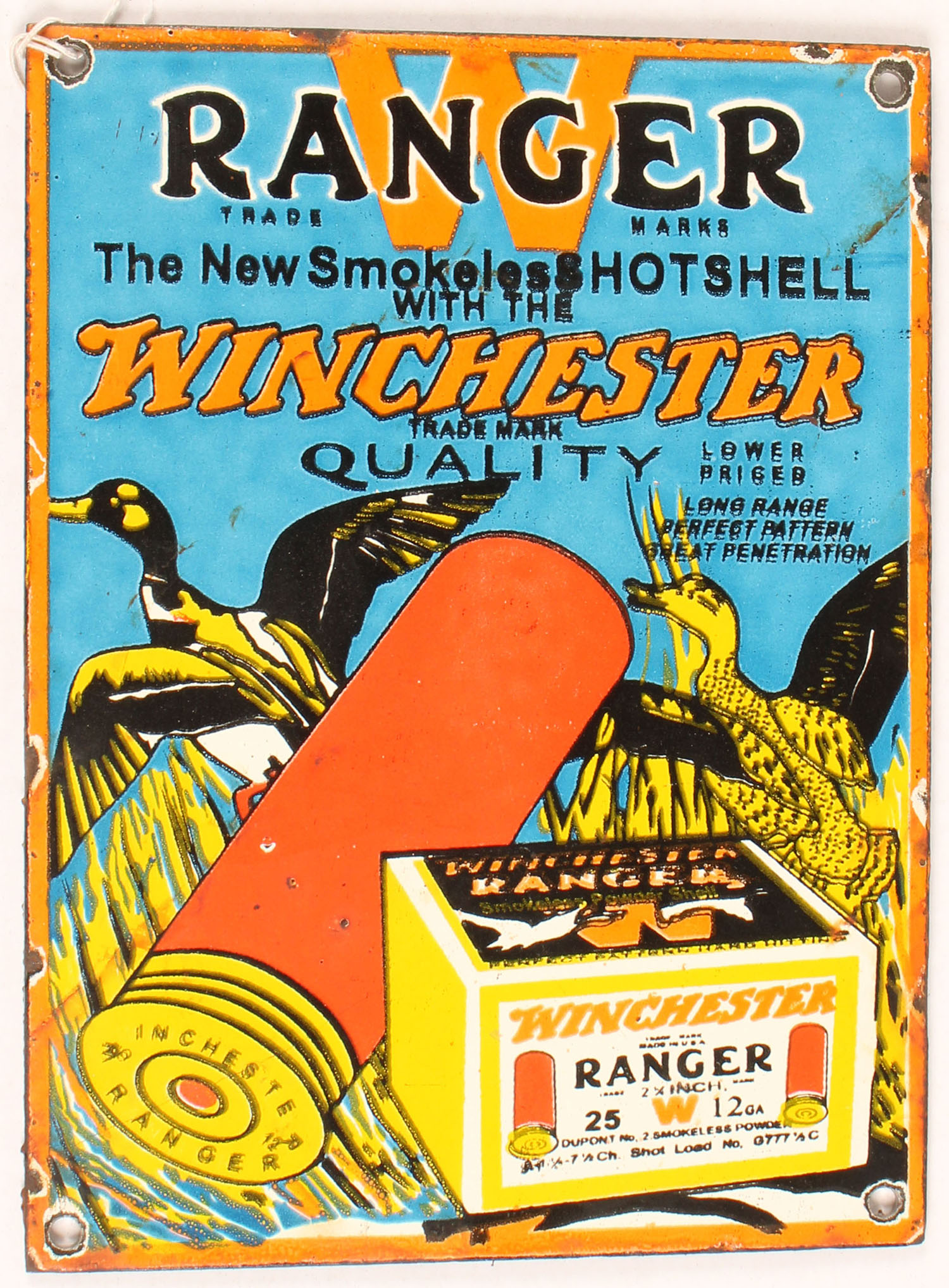 Winchester Ranger Porcelain Metal Sign, ''The New Smokeless HOTSHELL With The WINCHESTER Trade Mark Quality'', multi-color sign, one sided, black back, Has image of two ducks, shotshell & shotshell box, great colors, some words look double stamped, minor edge wear with paint loss around the hanger holes & some light speckling. 6'' x 8''. Grade: Very Good++ - Value: 100 to 200