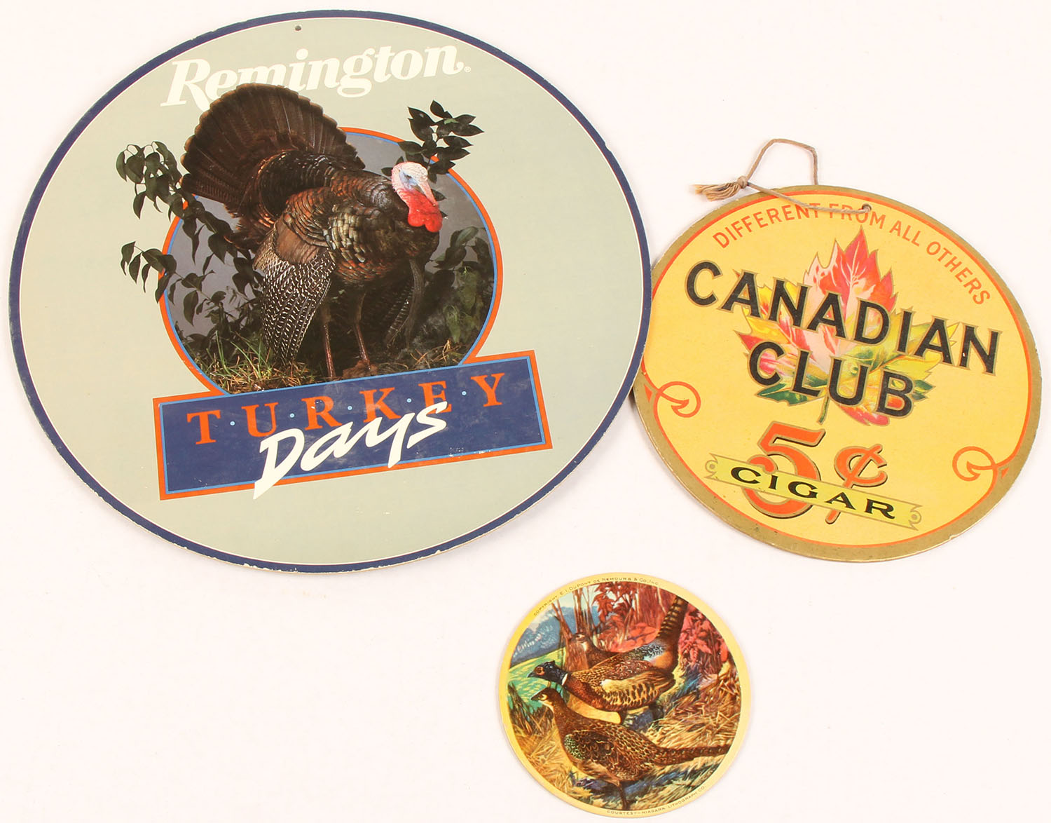 Lot of 3 cardboard advertisement signs, Remington, DuPont & Canadian Club, various sizes, full color images, the two larger ones are two sided & the smaller coaster size one is one sided. Grade: Excellent - Value: 10 to 50