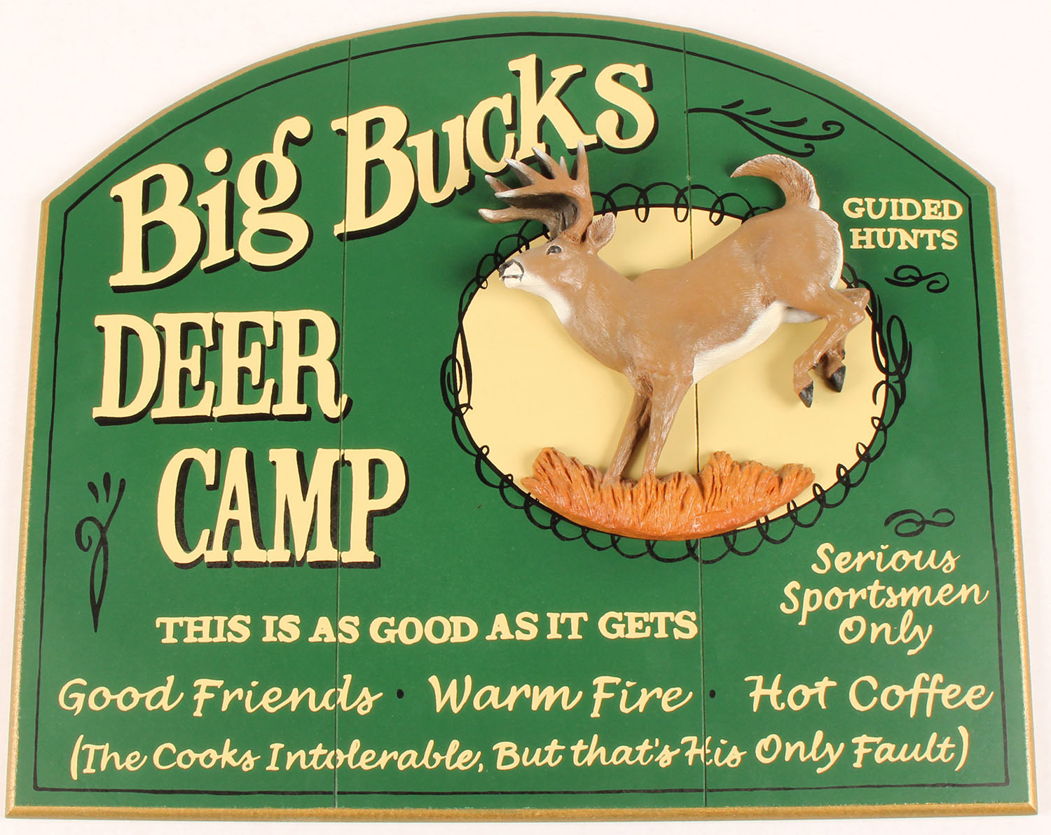 Big Bucks Deer Camp Guided Hunts 3D Wood Plaque, green/white sign, deer is painted in full color, integral wood hanger, excellent overall. Grade: Excellent++ - Value: 40 to 120