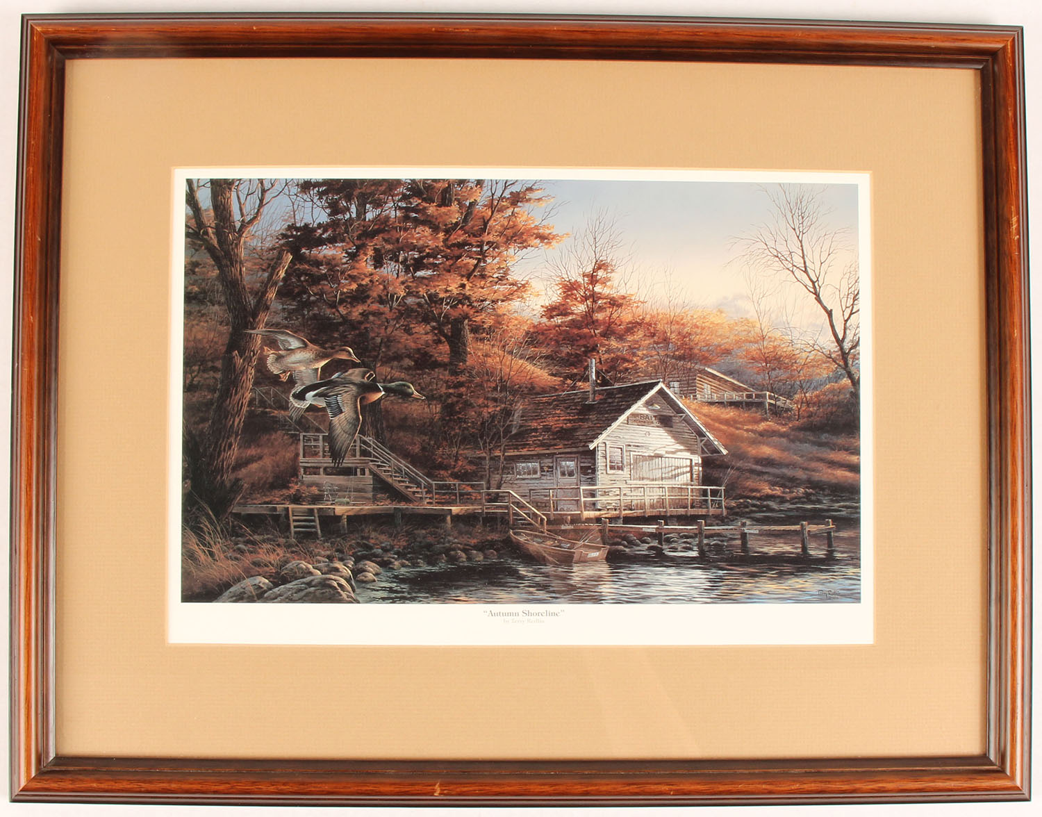 Terry Redlin ''AUTUMN SHORELINE'' Print, 1983, pictures a full color image of a bait & tackle shop, with two mallards in flight, wonderful image & colors, framed, 21'' x 16''. Grade: Excellent - Value: 20 to 200