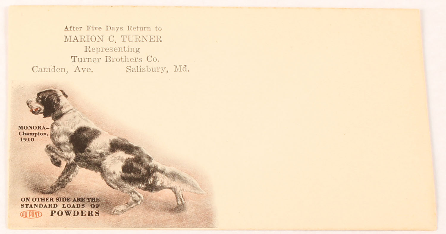 Du Pont Powders Envelope, 1923, features a full color image of a champion dog Monora & a load information chart on the back side. Grade: Excellent ++ - Value: 40 to 120
