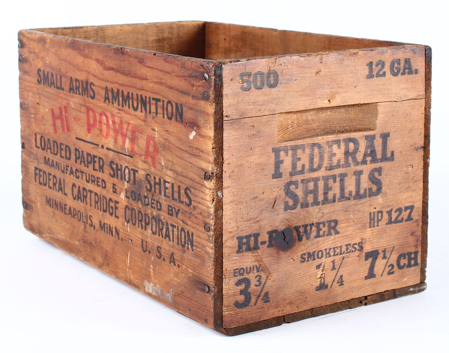Federal Hi-Power wood crate, HP127, 12ga., black print is solid and crate has age soiling. Grade: Very Good ++ - Value: 20 to 80