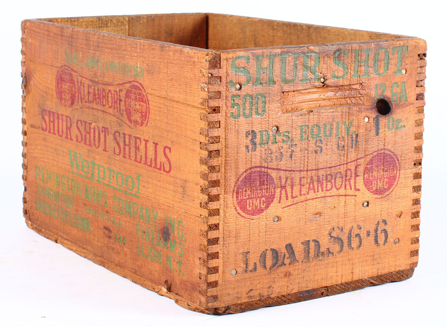 Remington UMC Kleanbore wood crate, .12 ga., black green, and red print is solid and crate has age soiling and some paint. Grade: Very Good ++ - Value: 20 to 60