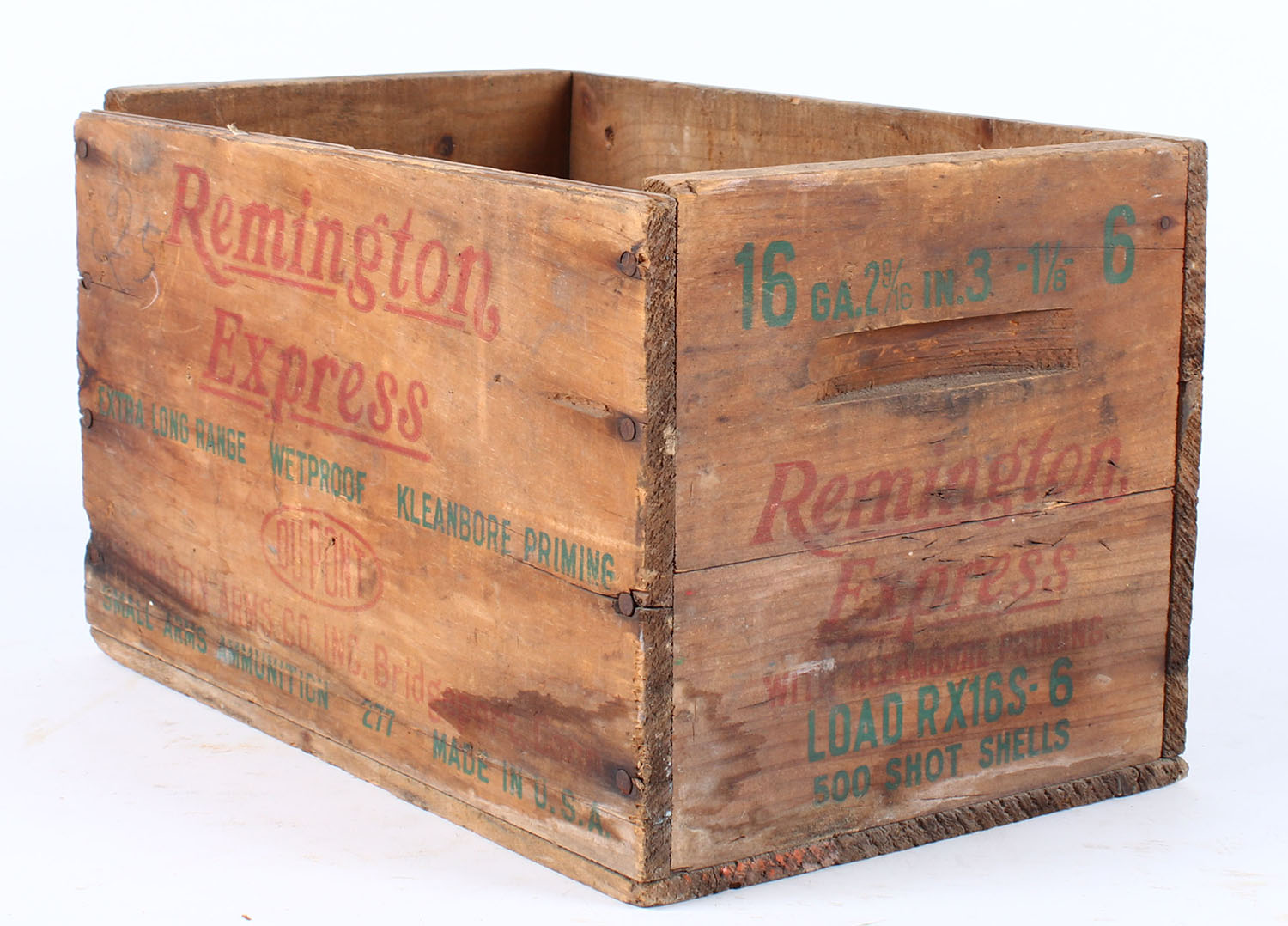 Remington, 16 Ga., Express, red, & green print has some fading and crate has age soiling. Grade: Very Good ++ - Value: 16 to 60