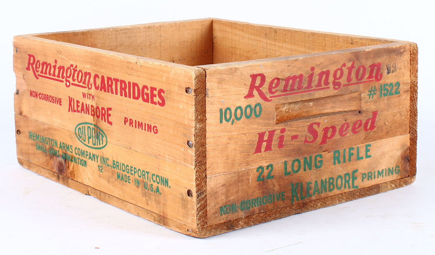 Remington, .22 LR Hi-Speed, red, & green print is solid and crate is nice. Grade: Excellent - Value: 10 to 60