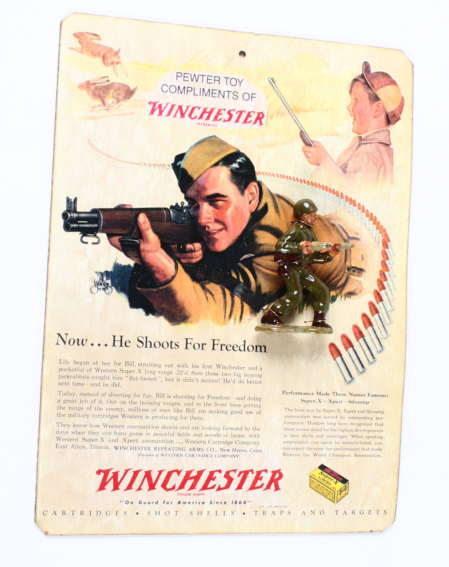 Winchester pewter toy on card, army man. Grade: Excellent ++ - Value: 20 to 60