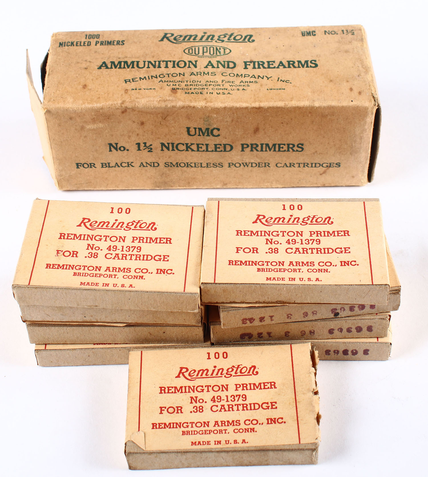 Remington Nickeled primers brick, 9/10 boxes all Full, brick sleeve doesn't match boxes inside. Grade: Excellent - Value: 20 to 80