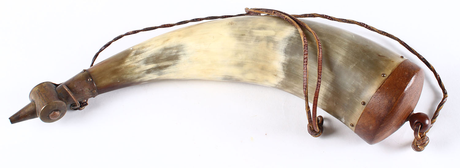 RARE! Mark B Burnham powder horn, dated 1955 CH 441, Empty. Grade: Excellent - Value: 50 to 100