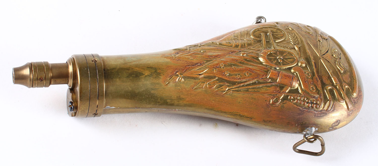 Antique Brass powder flask, double side with images of military flags and guns. Grade: Excellent - Value: 40 to 100