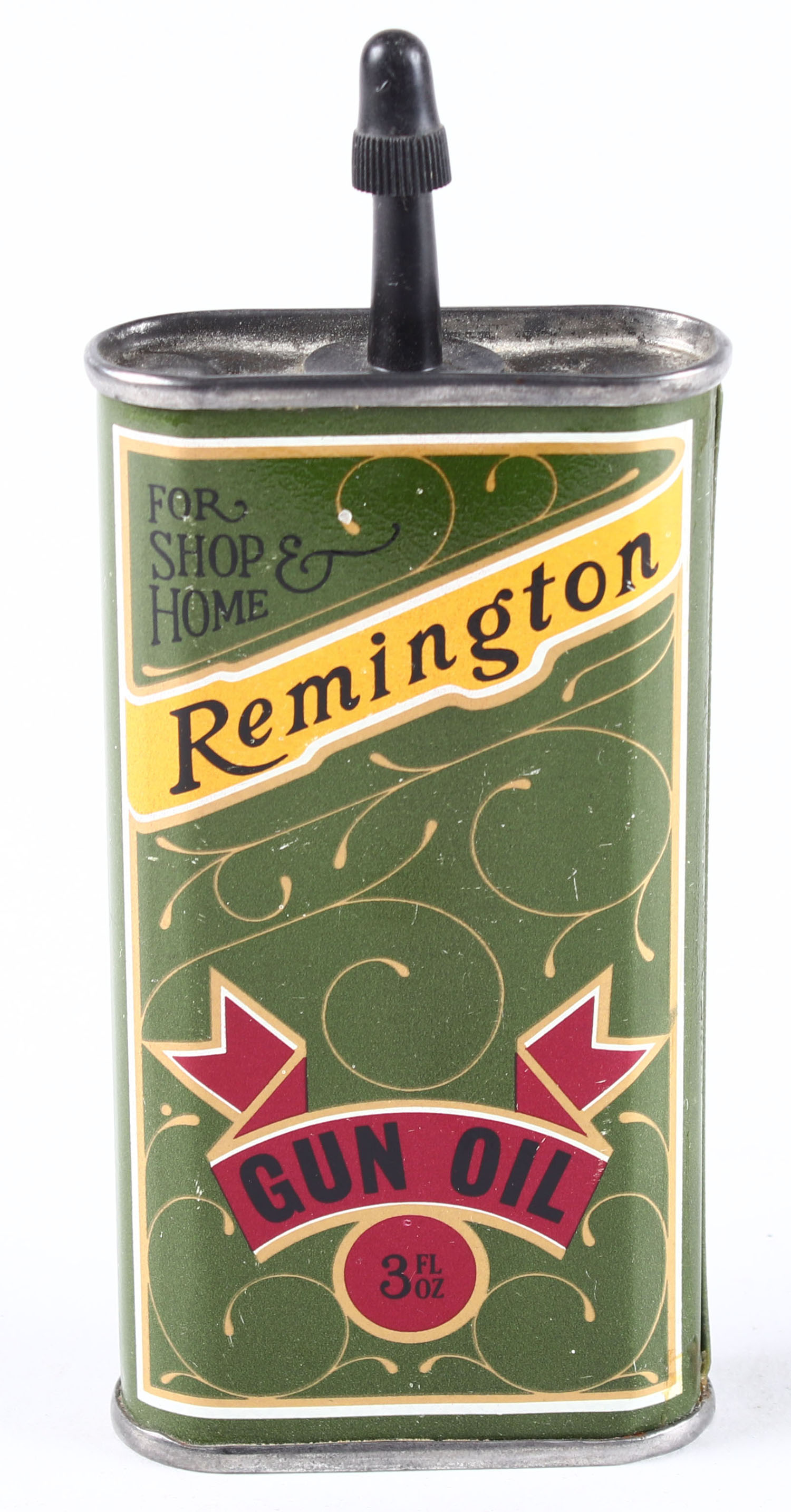 Remington oil tin, plastic spout and cap , FULL. Grade: Excellent + - Value: 10 to 40