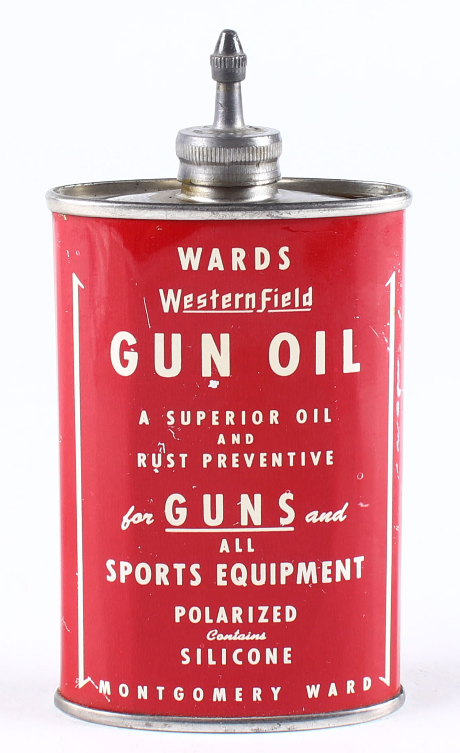 Wards Westernfield Gun Oil Tin, empty, very bright and clean. Grade: Excellent - Value: 20 to 60