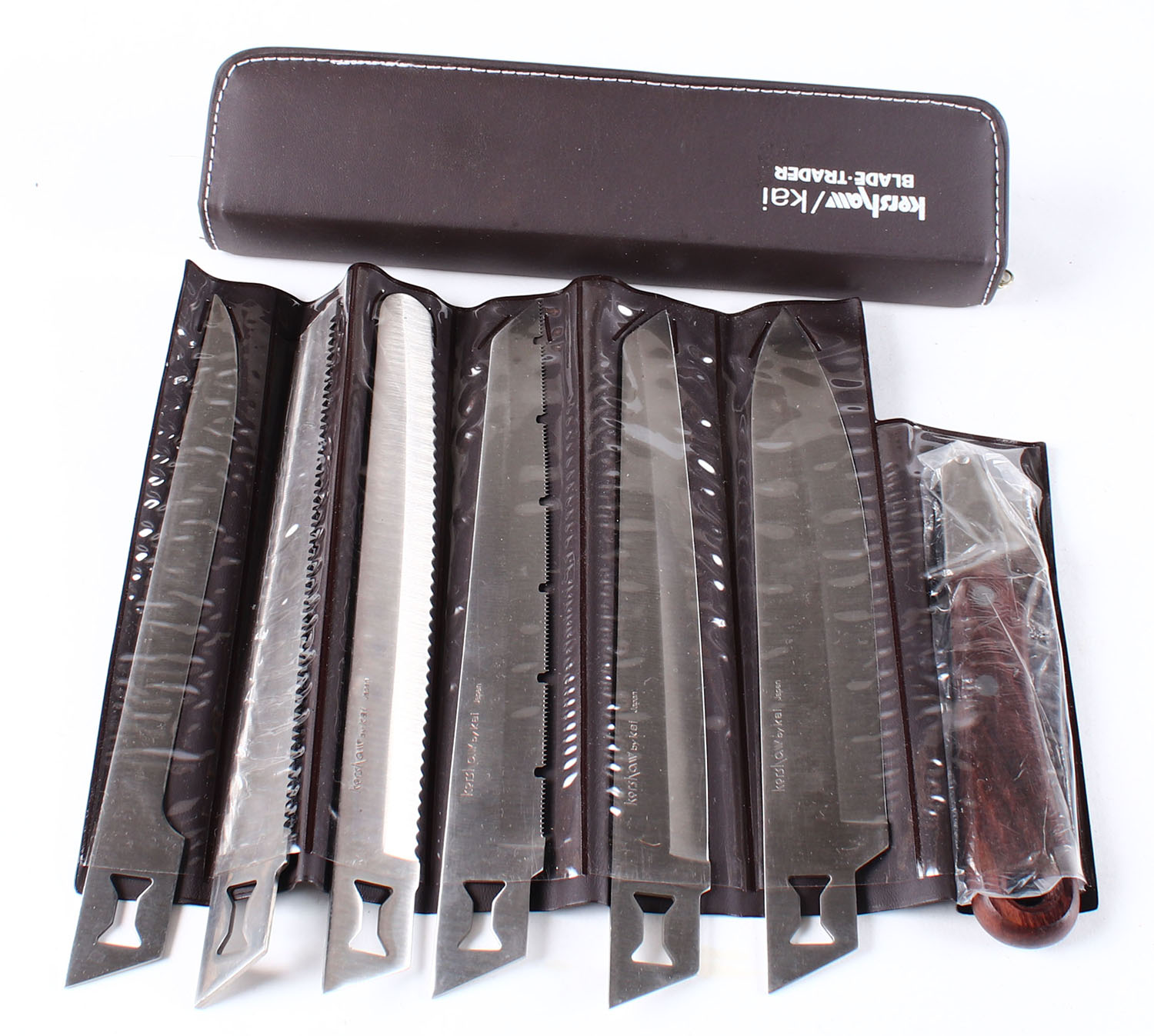 Large Kershaw kai blade trader fixed blade knife in original leather sheath, wood handle, numerous blades. Grade: Excellent ++ - Value: 50 to 150