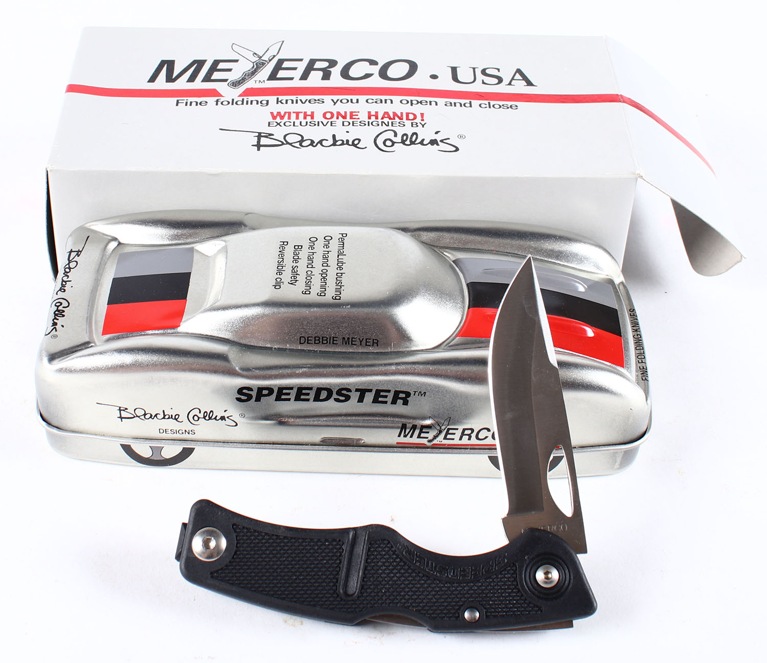 Meyerco Speedster knife, in original car shaped tin, with box, 3 3/4'' blade. Grade: Excellent ++ - Value: 20 to 40