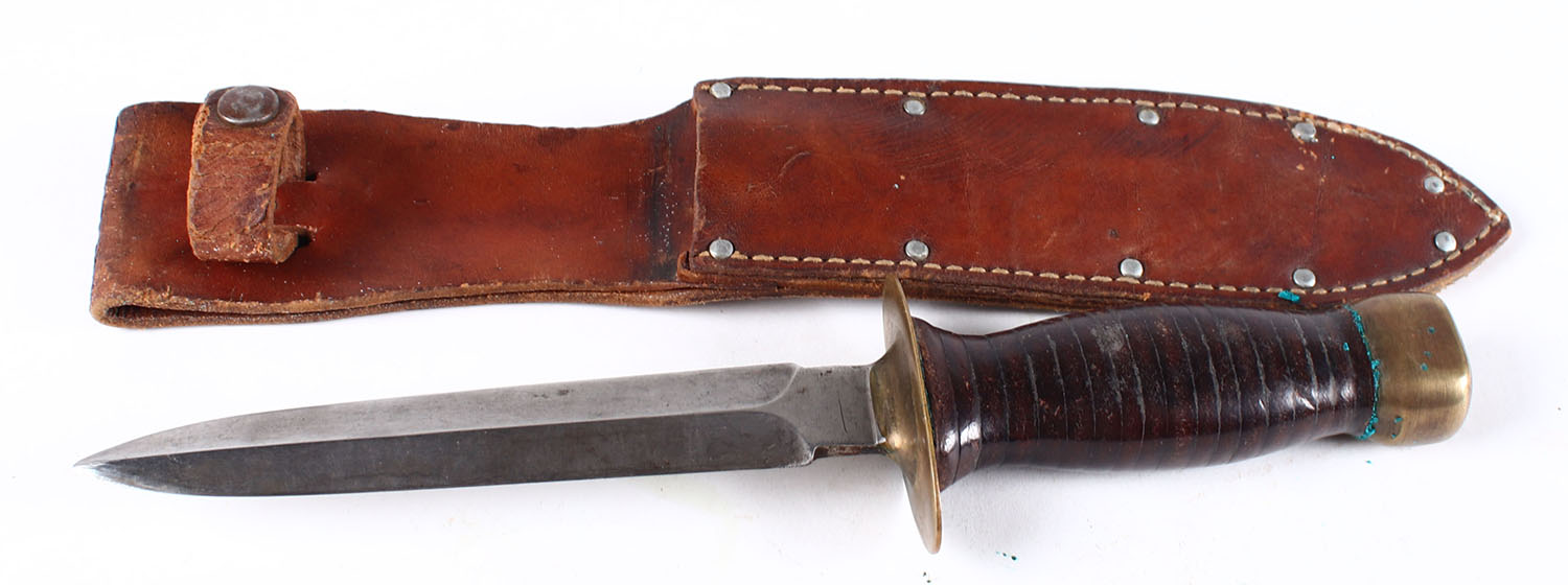 Unmarked knife, fixed blade, in leather sheath, 5.25'' blade, leather handle. Grade: Excellent - Value: 20 to 60