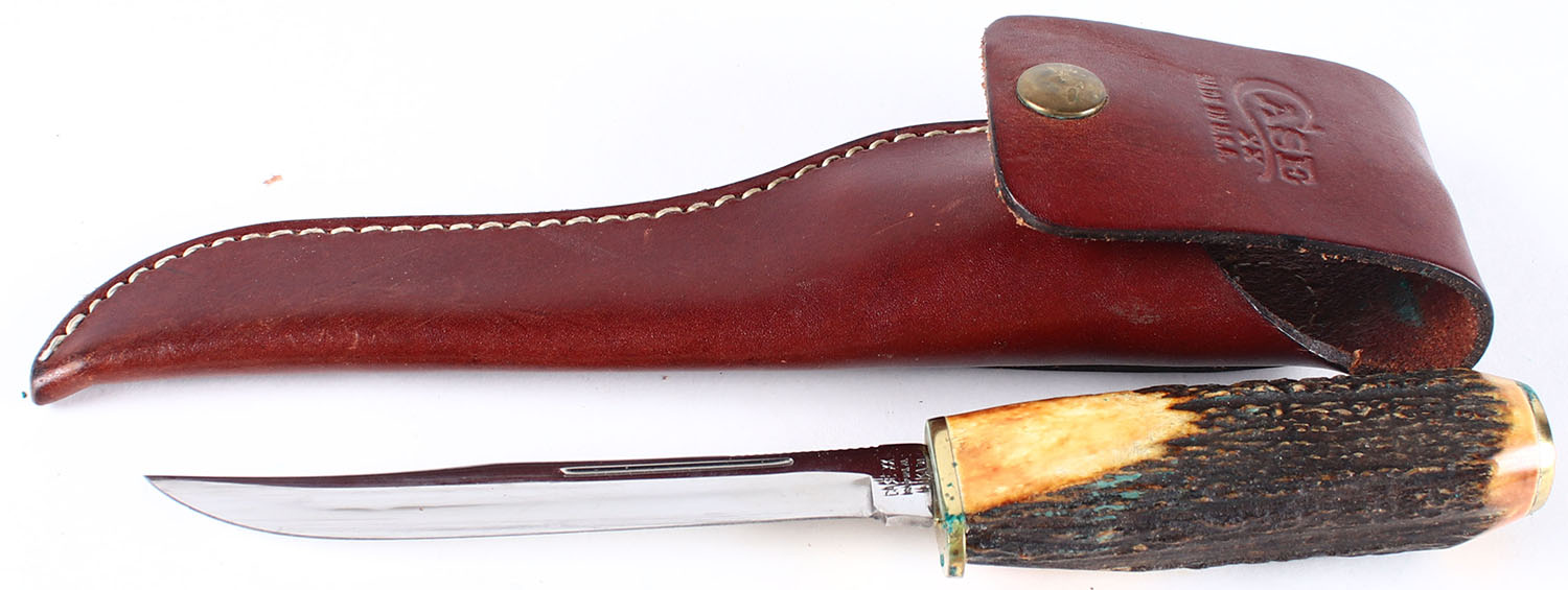 Case knife, fixed blade, has leather sheath, stag handle, 5'' blade, 516-5 SS. Grade: Excellent - Value: 50 to 150