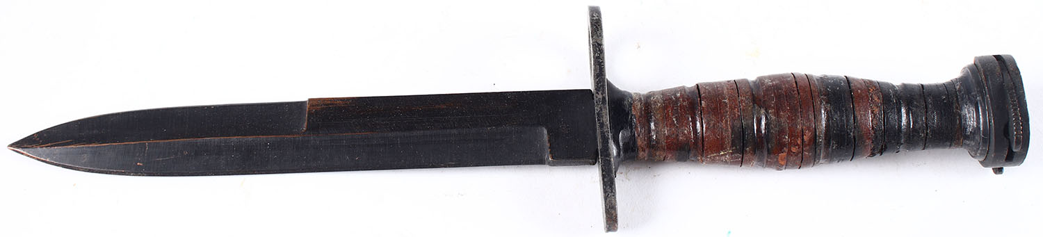 Unmarked bayonet, fixed blade, leather handle, 6'' longest blade. Grade: Excellent - Value: 20 to 80