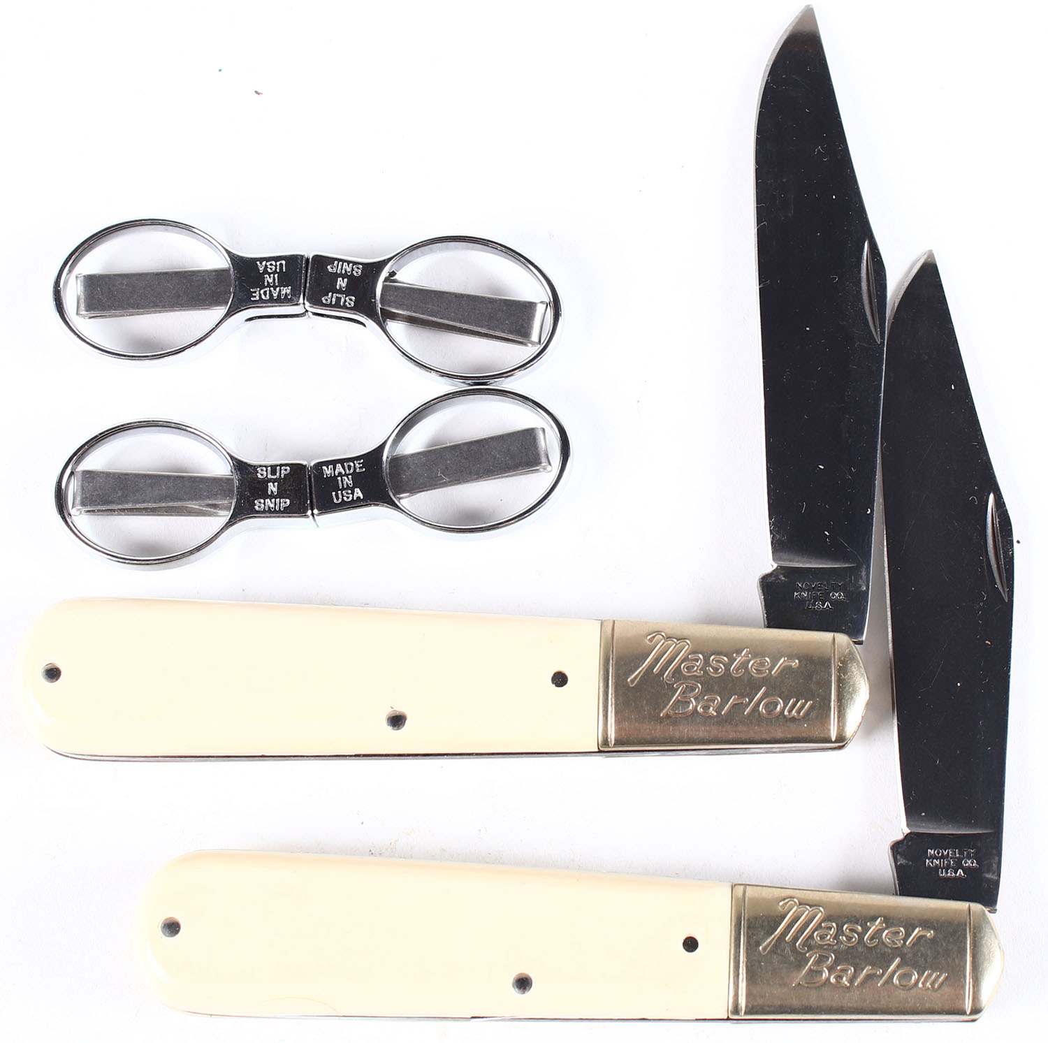 Lot of 4, 2 Master Barlow folding blade knives, and 2 folding scissors. Grade: Excellent ++ - Value: 40 to 100