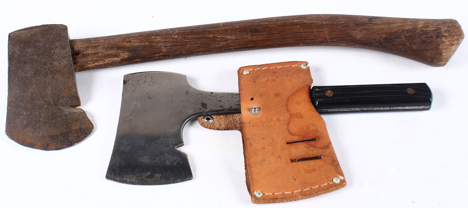 Lot of 2 hatchets, 1 has leather sheath, both have age soiling . Grade: Very Good - Value: 10 to 50